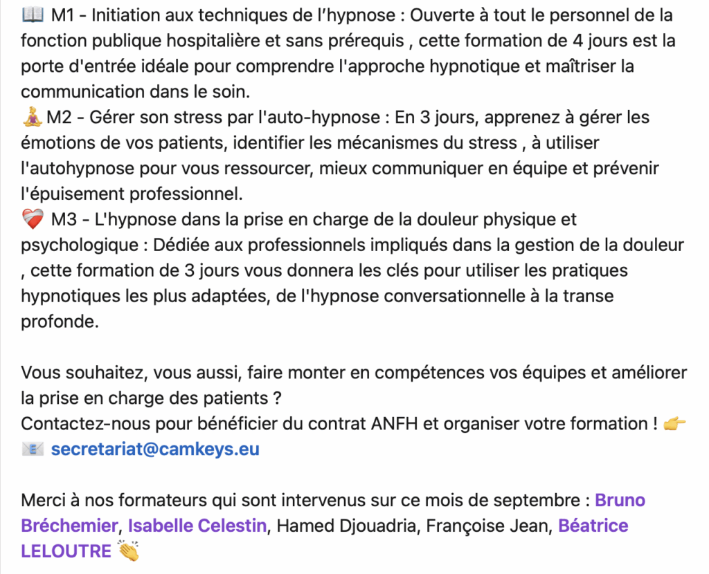 J’anime des formations destinées à des professionnels de santé. L’approche que je transmets met l’accent sur la relation, les sensations, l’intuition, et l’écoute profonde du patient. Elle place la personne au centre et encourage une pratique plus humaine, ouverte et intégrative.